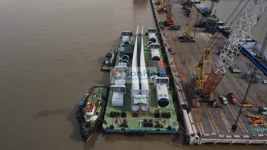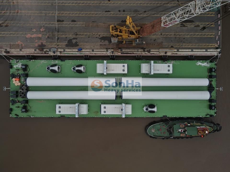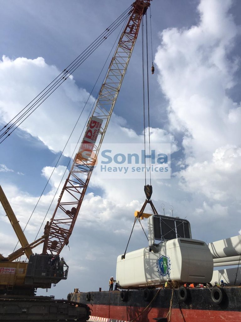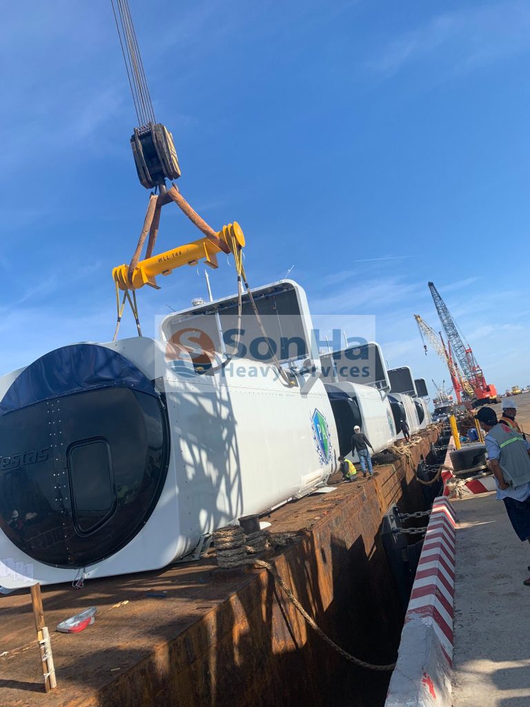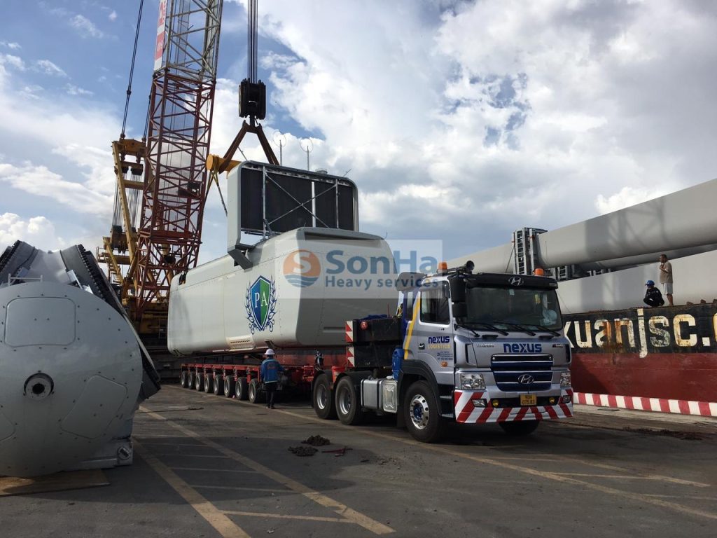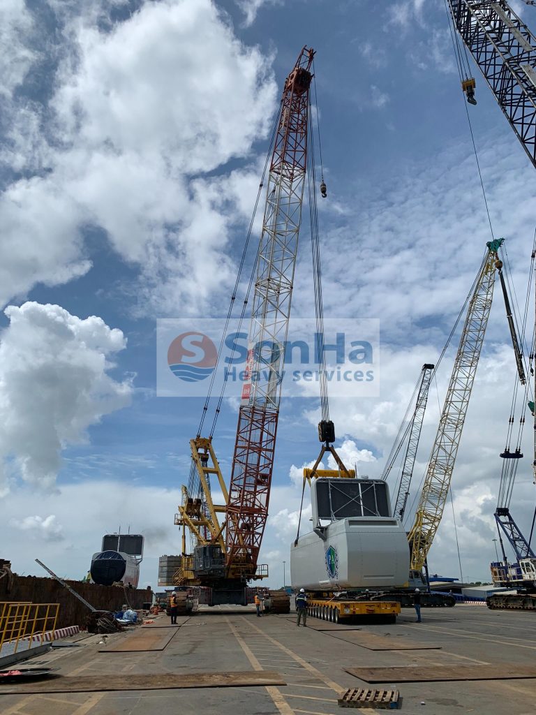 Loading 24 sets nacelle components weigh 138T from trucks onto barges transport at Long An port
