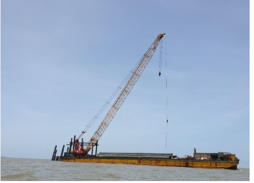 Equipment transportation: The barge acts as a platform for installing heavy equipment such as pile hammers, bored pile drilling machines, and other necessary materials to the construction site at sea.