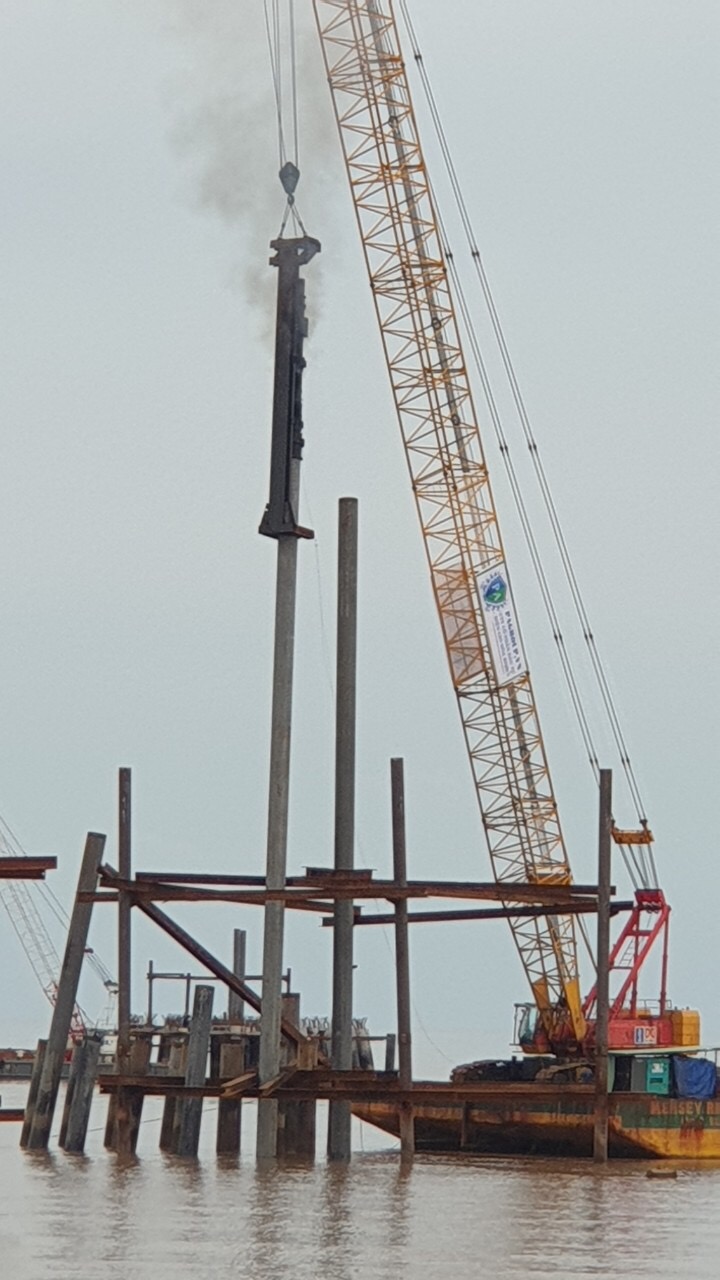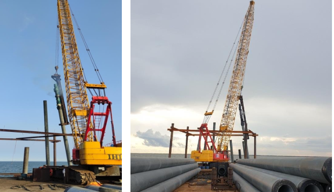 Pile driving: The 200T crane (with a lifting capacity of 200 tons) is used to lift and lower heavy steel piles or concrete piles, position them in the correct position and support the process of driving or drilling piles into the seabed.